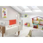 Precioso juego de sábanas para cuna con estampado de 3 casitas sobre fondo blanco, y borde de sábana y cojinera en alegres colores.