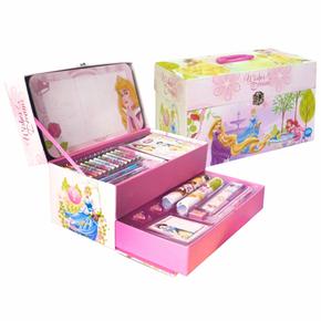 Maletín fantasía pizarra Princesas Disney que incluye 12 ceras de colorear, 3 hojas de pegatinas, 1 goma, 3 rotuladores, 2 láminas a color, 12 láminas de colorear, 1 regla, 1 sacapuntas, 2 pinzas, 1 bloc de notas adhesivas, una pizarra, un rotulador para pizarra y 2 lápices.